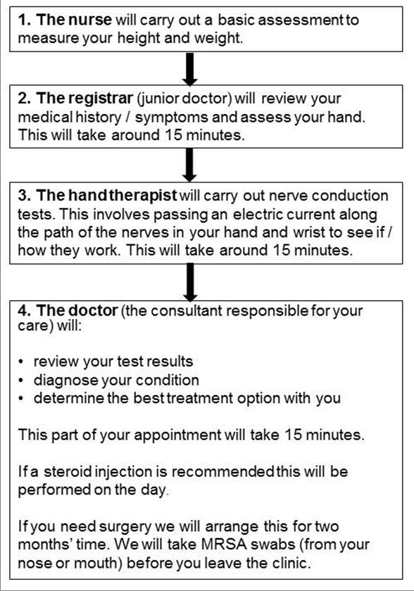 The aim of this clinic is to provide a smooth and efficient pathway for people with suspected carpal tunnel syndrome (compression of the median nerve at the wrist). We carry out a clinical assessment, nerve conduction studies and a specialist assessment all in one appointment. If appropriate, we will also schedule you for surgery, which we aim to offer within two months of your first appointment.